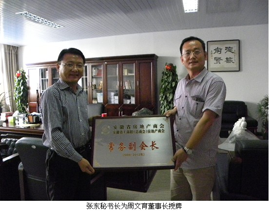 日前,经安徽省房地产商会会长办公会议研究通过,周文育董事长当选为省房地产商会常务副会长。5月10日下午,省房地产商会秘书长张东一行莅临我司参观指导,并与周董亲切交谈。