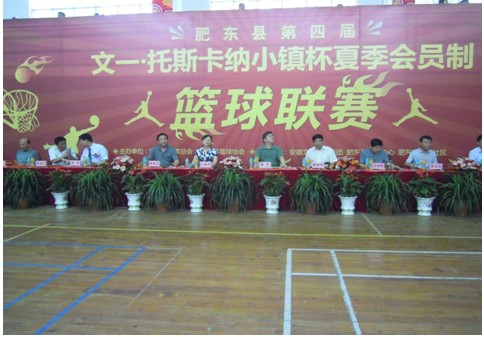 7月10日上午,肥东县第四届文一?托斯卡纳小镇杯夏季会员制篮球联赛开幕仪式在肥东师范室内体育场盛装开启。本次联赛由安徽文一投资集团独家冠名,肥东县体育总会、肥东县篮球会主办。共有17支代表队近300名运动员参加,赛期:7月10日至8月22日。
