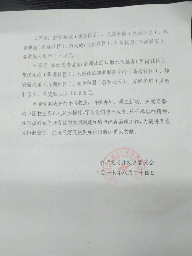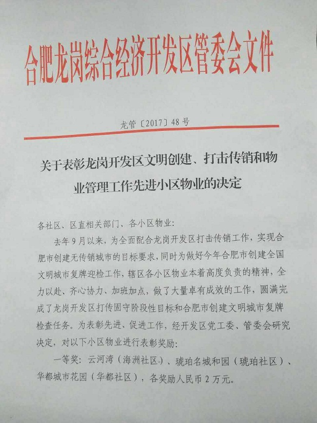 8月24日,合肥龙岗开发区管委会发布关于辖区文明创建、打击传销和物业管理先进小区物业的决定,文一·云河湾小区荣获一等奖,奖金2万元,文一·瑞泰和园小区获三等奖,奖金0.5万元。