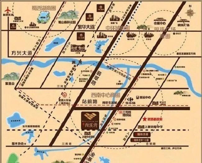 文一·西溪湾项目位于翡翠路与乐平路交口,项目紧邻城市主干道金寨路与翡翠路,位于家乐福商圈范围内。东侧为规划中的三号线地铁口。西侧为肥西火车站,将改造扩建为肥西高铁站,肥西高铁站区域集合安九高铁站场、汽车客运站于一体,未来将形成合肥主城区西南交通枢纽。