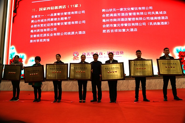 11月15日,第七届中国徽菜博览会颁奖晚会在中国书法大厦隆重举行。作为本届中国徽菜博览会的重头戏,颁奖盛典可谓精彩纷呈,奖项设置丰富、创意独特,3个小时的颁奖活动,让众多酒店喜获丰收,荣耀而归。其中,文一·一品宴铜陵路店凭借超强的实力,荣获全国酒家酒店等级评定委员会颁发的“国家四钻级酒家”,并获“博览会最佳宴席奖”、“十佳宴席品牌”、“优秀正餐品牌”三项大奖,同时酒店总经理郝安丽个人荣获“服务金匠奖”。文一餐饮旗下另一家国际精品商务酒店戴斯大饭店也同获“优秀正餐品牌”、“优秀喜宴品牌”两项大奖。七项大奖的“收入”,使得文一餐饮成为本届徽菜博览会的大赢家。