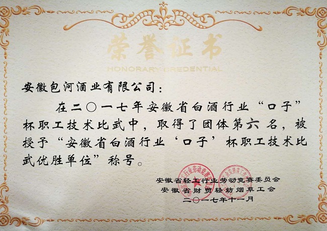 近日,包河酒业组织代表队参加由安徽省财贸轻纺烟草工会和安徽省轻工行业劳动竞赛委员会组织的“安徽省白酒行业职工技术比武”大赛。在此次酿酒技术比武中,包河酒业代表队沉着应战,奋力拼搏,最终获得团体第六名,酒业员工仲维民同志荣获安徽省白酒行业酿酒技术比武一等奖,并被授予“安徽省轻工行业技术状元”称号,包河酒业被授予“安徽省白酒行业职工技术比武优胜单位”荣誉称号。
