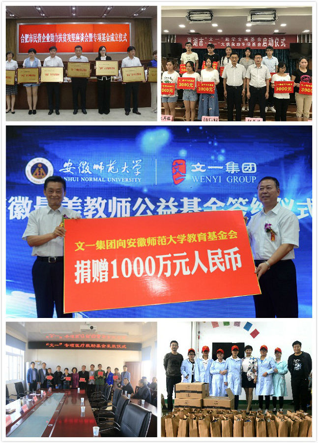 在多元化产业助推企业发展壮大的同时,文一人深知,企业来源于社会,必将回归社会。自创立之初,集团董事长周文育就确定了“砖瓦精神 贡献社会”的企业使命,急社会之所急,想社会之所想,通过广阔的平台传递正能量,创造更多的社会价值。