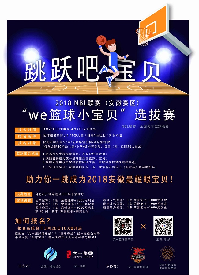 2018 NBL 篮球联赛要来啦!大篮球迷和小篮球迷们又要沸腾啦!蓄势待发的安徽文一“篮”神们将在原国家队主教练宫鲁鸣为首的教练组率领下,再度开启安徽篮球新征程。在NBL正式开赛之前,合肥市广播电视台联合文一集团特别推出文一地产杯“跳跃吧,宝贝”2018安徽赛区篮球小宝贝选拔赛,为安徽篮球助威,为文一男篮加油!