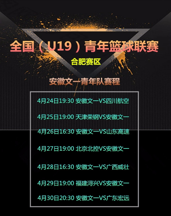 4月24日-30日,2018年全国(U19)青年篮球联赛合肥赛区赛事将在肥东一中新校区体育馆拉开战幕。近日,合肥赛区正式公布了本次比赛赛程,拥有主场之利的文一青年队首场比赛将对阵四川航空,收官战则是迎战广东宏远。与去年第一阶段赛事轻松夺冠不同,今年的对手实力都非常强劲,对文一青年队来说场场都是硬仗。