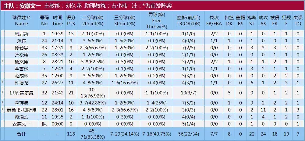 全场比赛,安徽文一12名球员全部得分,其中6人上双。霍尔曼得到21分和10个篮板,罗切斯特16分和11次助攻,周启新15分,韩德龙11分和6次抢断,杨文博和李祥波各有10分进账。
