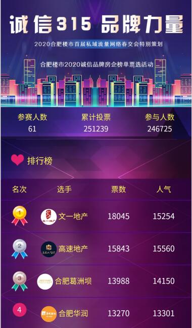 据了解,截止3月14日,诚信品牌房企、诚信楼盘票选活动总计吸引近25万人次参与投票,直观展示出各品牌房企的产品品质和服务水平。榜单中的每一票均承载着消费者对品质人居、美好的生活期望,是对诸房地产品牌力和产品力的考验,更是对品牌房企未来持续提升品质、追求卓越的激励和鞭策。