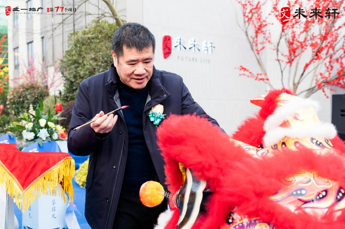 而紧接而来的舞龙舞狮表演再次将现场氛围推向新的高潮,文一房地产集团执行总裁/合肥东区城市公司董事长陈嘉祥轻执朱笔为醒狮点睛,瞬间锣鼓喧天,掌声齐鸣。醒狮献瑞,万福吉祥,现场完美展现了文一·未来轩美学示范区的国韵华彩。