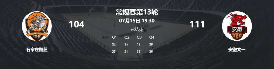 7月15日晚,安徽文一在常规赛第13轮中客场对阵石家庄翔篮。在上半场落后两位数和队长杨文博伤退的不利情况下,安徽文一下半场开启绝地反击。王思奇和郑祺龙扮演奇兵,皮埃尔·杰克逊末节接管比赛,安徽文一最终以111:104逆转战胜石家庄翔篮。