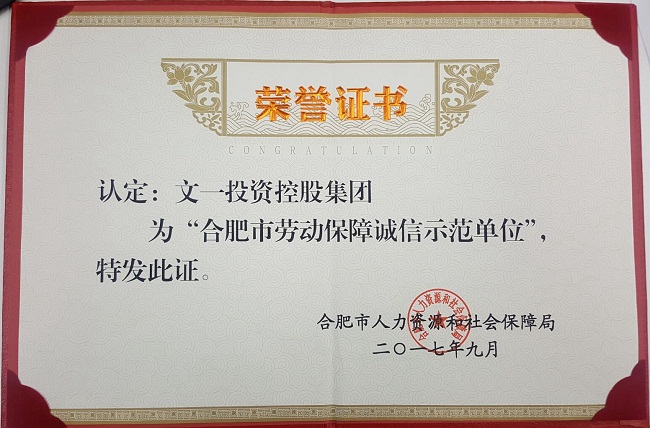 1月19日,合肥市2017年度劳动保障诚信示范单位表彰大会隆重召开,经合肥市人力资源和社会保障局综合审定,文一集团在众多企业中脱颖而出,荣获2017年度“合肥市劳动保障诚信示范单位”称号。