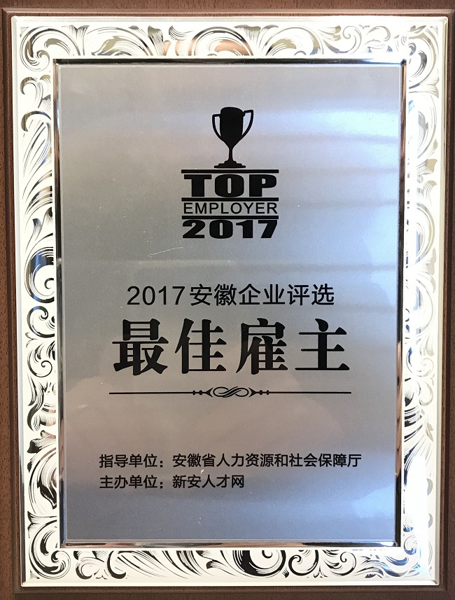 1月24日下午,由安徽省人力资源和社会保障厅指导、新安人才网主办的2017安徽企业最佳雇主评选颁奖盛典在合肥大剧院隆重举行,经前期多个环节评选,文一集团荣膺“2017安徽企业最佳雇主”称号。