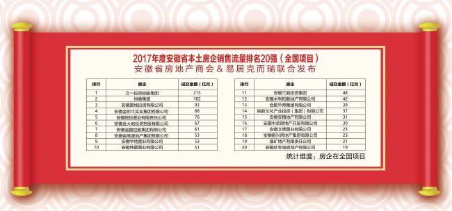 1月25日,2017年度安徽省房地产百强企业榜单在合肥发布,在安徽本土房企销售流量排名20强(全国项目)及安徽省房企慈善排行榜中,文一集团双双位居榜首。