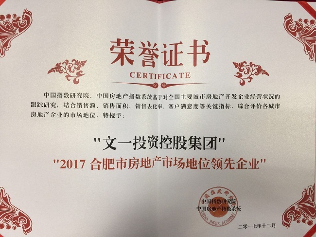 12月20日,2017第十四届中国数字地产节在北京召开。基于对全国主要城市房地产开发企业经营状况的跟踪研究,结合销售额、销售面积、销售去化率、客户满意度等关键指标,文一投资控股集团被中国指数研究院授予“2017合肥市房地产市场地位领先企业”称号,是唯