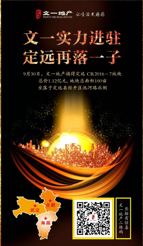 9月30日,文一地产摘得定远CR2016-7号地块,总价1.12亿元。地块总面积100亩,坐落于定远县永康大道与岱山路交叉口西南角。
