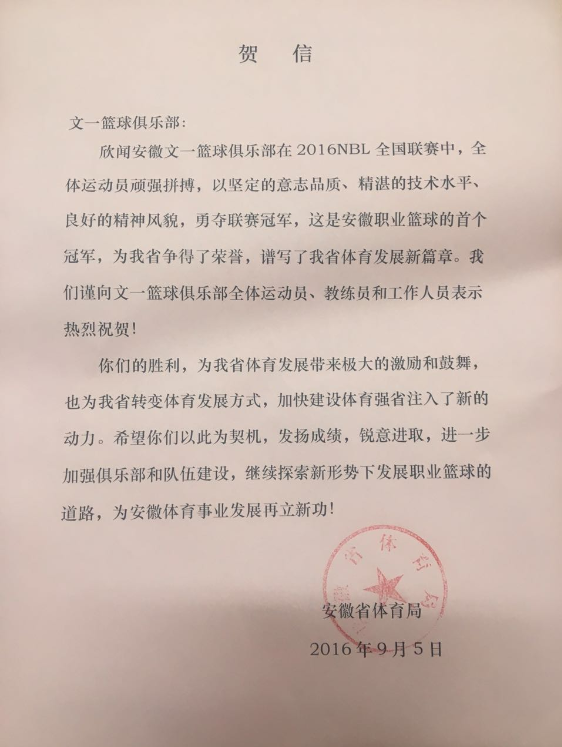 9月5日,安徽省体育局给文一篮球俱乐部发来贺信。省体育局在贺信中表示,“文一男篮夺得的这个冠军,为我省争得了荣誉,谱写了我省体育局发展新篇章。我们谨对文一篮球俱乐部全体运动员、教练员以及工作人员表示热烈祝贺。”