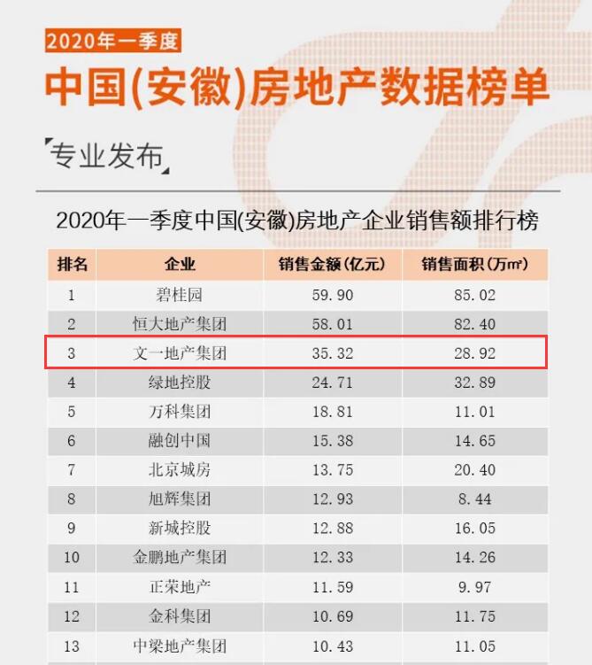 3月31日上午,新安大数据研究院独家发布《2020年一季度中国(安徽)房地产企业销售额排行榜》,文一地产荣登榜单TOP3,稳居安徽省本土房企第一。